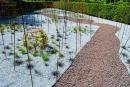 空靈之園是一個(gè)以若干網(wǎng)狀空心球體為主體所構(gòu)成的庭院空間。設(shè)計(jì)師們?cè)趫@中支起了一個(gè)龐大的不規(guī)則網(wǎng)狀物,它延伸至園中的每一個(gè)角落,形成一個(gè)個(gè)形狀各異的子空間。在這些子空間之間,隨意放置著大小不一的網(wǎng)狀空心球體,它們似乎在匯聚著一種能量,這種能量足以改變園中的現(xiàn)狀,將人們帶入一個(gè)充滿生機(jī)與歡樂(lè)的時(shí)空之中。然而,每個(gè)獨(dú)立的球體本身所產(chǎn)生的壓抑感卻阻礙了這股能量的匯聚,使得歡樂(lè)與和諧的氣息無(wú)法得以釋放。這些網(wǎng)狀空心球體的表面零星地攀附著一些五葉地錦,每個(gè)球體周?chē)荚O(shè)有種植區(qū),里面種植著一些草本植物,球體就如同這些植物的能量空間,這些種植區(qū)與球體的距離越遠(yuǎn),植物所得到的養(yǎng)分就越少,因而可能出現(xiàn)長(zhǎng)勢(shì)不良、色彩暗黃等現(xiàn)象,最終枯竭而亡,而毗鄰球體的種植區(qū)則能獲得充分的養(yǎng)分,長(zhǎng)勢(shì)旺盛,球體周邊種植區(qū)進(jìn)而形成了從充滿生機(jī)的綠色空間向雜亂而荒蕪的空靈空間逐漸轉(zhuǎn)變的過(guò)程。